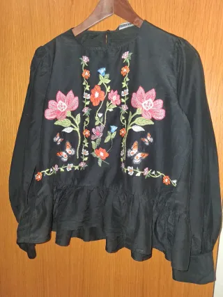 Camisa negra con un bonito diseño bordado de flores y mariposas. - Mangas largas abullonadas. - Volante en el bajo. - Cierre de botón en la nuca.