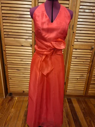 Elegante vestido largo de color rojo, perfecto para eventos especiales. Presenta un diseño halter y un detalle de lazo en la cintura. - Tejido satinado brillante. - Falda larga y fluida. - Cierre de cuello halter.