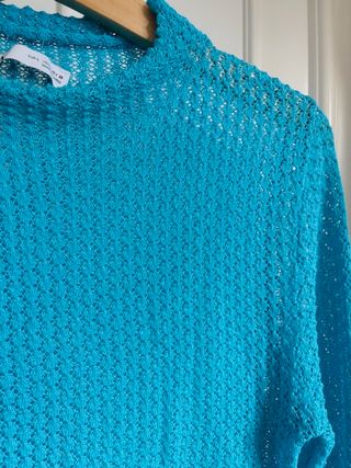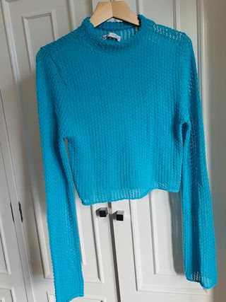 Top de malla de Zara con cuello alto y manga larga. Un diseño moderno y llamativo. Top corto de punto talla M de Zara. Top calado con un color azul turquesa precioso. Manga larga. Transparencia. Está puesto sólo 2 veces, como nuevo, perfecto estado.