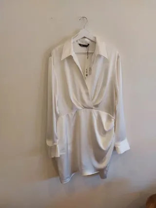 Camisa de satén blanco Zara Join Life con diseño drapeado elegante, cuello camisero, mangas largas con volumen y caída fluida ideal para looks sofisticados. Tejido brillante y cómodo, corte oversize que favorece. Nueva con todas las etiquetas, perfecta para oficina, cenas o eventos. Talla confirma en etiqueta interna (vislumbra M/L).