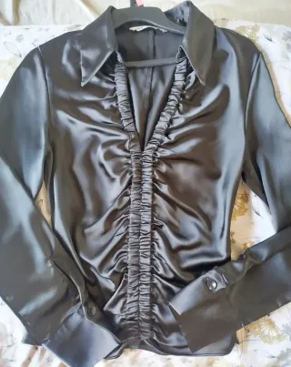 Elegante camisa de Zara con un diseño drapeado y acabado satinado. - Cuello camisero. - Cierre de cremallera lateral invisible. - Puños con botón. - Detalle fruncido central. - Entallada.