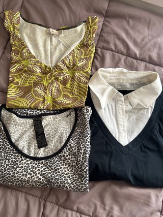 Conjunto de tres camisetas de la marca Zara. - Camiseta con estampado floral en tonos marrones y verdes. - Camiseta con estampado de leopardo. - Camiseta negra con cuello de camisa blanco.