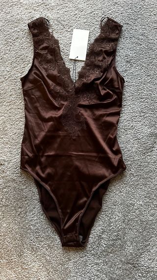 Precioso body de Zara en color marron chocolate con detalle de bordados en el escote. Con protector. Talla XS