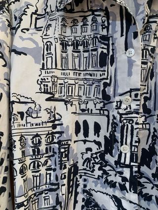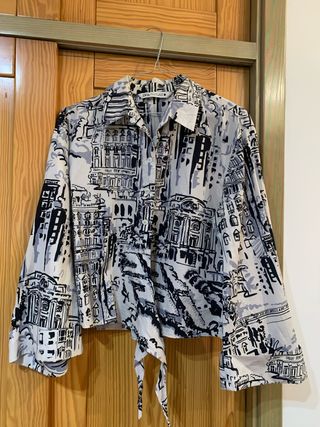 Camisa de Zara con un diseño artístico y llamativo. - Estampado abstracto de edificios y elementos urbanos. - Cuello camisero clásico. - Cierre de botones. - Detalle de lazada en la parte delantera. - Mangas largas acampanadas.