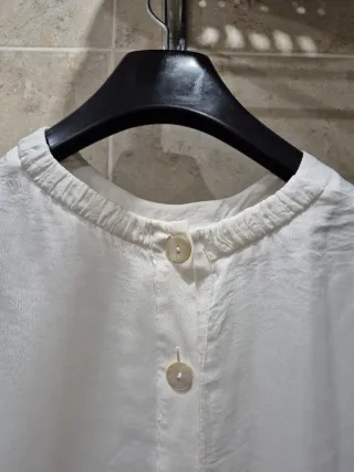 💥💫 Blusa blanca de lino con manga hasta el codo abullonada con elástico, corte recto y cierre delantero con botones metálicos asimétricos. 100% lino Talla M Medidas: De axila a axila, 60 cm De largo, 63 cm 💫💥💫💥💫💥💫💥