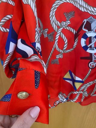 Elegante blusa de seda con un llamativo estampado náutico. - Diseño con cuerdas, anclas, estrellas de mar y banderas. - Cuello camisero y cierre de botones dorados. - Manga larga. Sin estrenar .tejido tipo seda