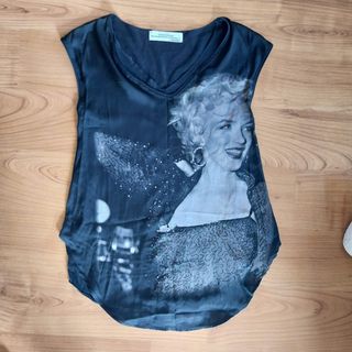 Blusa de Zara con estampado de Marilyn Monroe. - Diseño con cuello en V. - Estampado frontal de Marilyn Monroe. - Detalle de lentejuelas y encaje. (Solo envíos) Blusa Zara Edición Marylin collection, talla M. 42 cm de hombro a hombro y 77 de largo.