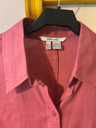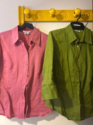 Conjunto de dos camisas de lino de Zara, una en color rosa y otra en verde. Tallas M y L - Camisa de manga larga. - Cuello camisero. - Cierre de botones.