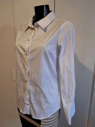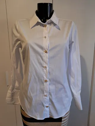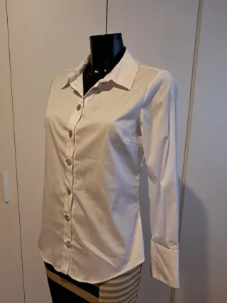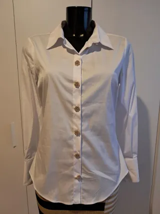 Elegante camisa blanca de manga larga, perfecta para cualquier ocasión. Destaca por sus detalles únicos. Le hace falta un botón a cada manga. - Cuello clásico. - Cierre de botones. - Botones joya dorados y nacarados.