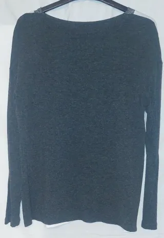 Camiseta de manga larga de Zara con un diseño frontal llamativo. Talla S. - Color gris marengo. - Estampado trasero con texto - Cuello redondo. - Corte holgado. - Largura desigual, parte delantera más corta. - Aberturas laterales. En perfecto estado.