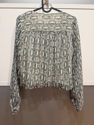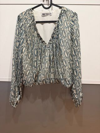 Elegante blusa con estampado animal print de Zara. Un diseño llamativo y moderno. - Cuello alto. - Mangas abullonadas.