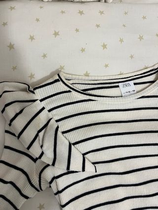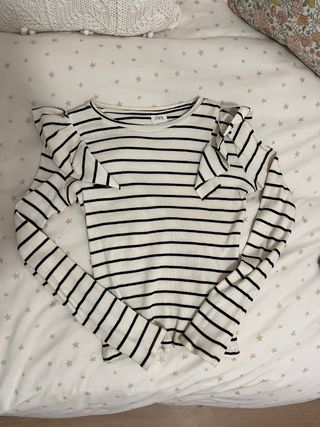 Precioso top de Zara con un diseño de rayas clásico y detalles de volantes en las mangas. - Manga larga. - Cuello redondo. - Tejido acanalado.