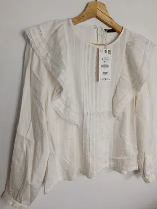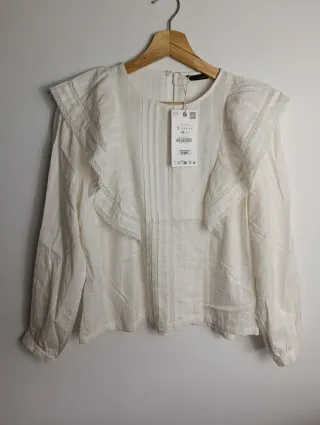 Elegante blusa de Zara con un diseño de volantes. - Mangas acampanadas. - Cuello con volantes. - Cierre frontal.