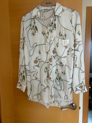Blusa de satén con un llamativo estampado marinero. - Diseño con cadenas, boyas y anclas. - Cuello camisero. - Cierre de botones. - Bolsillo en el pecho.