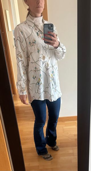Como nueva. Botones en hombro. No se arruga. Muy fresca. Queda suelta. Corté la etiqueta de composición pero se lava en lavadora.
