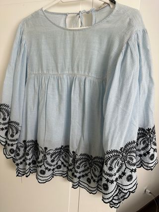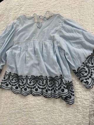 Camisa de Zara con un diseño de rayas azules y un bonito bordado negro en el bajo y las mangas. - Diseño de rayas finas azules. - Detalle de bordado floral negro. - Mangas largas acampanadas. - Cierre de lazada en la espalda.