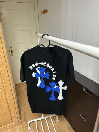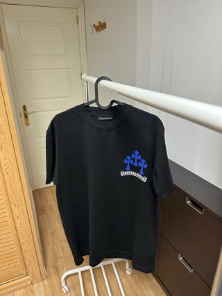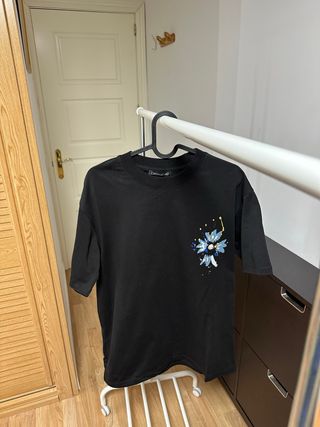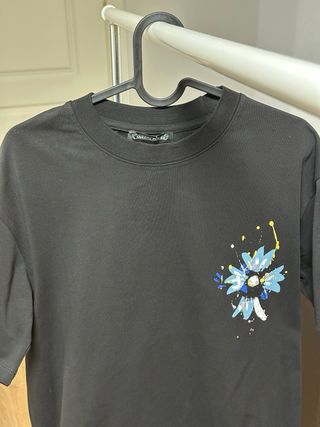 Camiseta negra con un diseño floral único en el pecho. - Estampado de flores azules y blancas. - Detalles en dorado y salpicaduras. - Corte moderno y cómodo.
