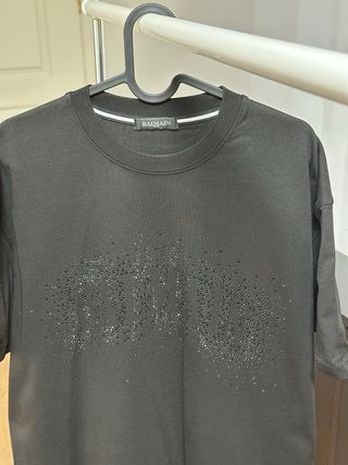 Camiseta de manga corta de la marca Balmain en color negro. Presenta un diseño frontal con detalles brillantes. - Logo de la marca en la etiqueta interior. - Tengo mas tallas hablame para mas información