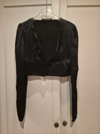 Chaqueta corta de satén con un diseño elegante. - Manga larga con 1 botón. - Cierre de botones 6. - Escote pronunciado. - Medidas: cuerpo largo 37cm / manga largo 64cm.