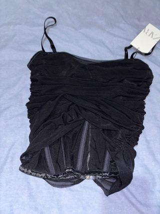 Corsé negro de Zara, sin estrenar y con etiqueta. - Diseño fruncido. - Tirantes finos ajustables. - Tejido semitransparente.