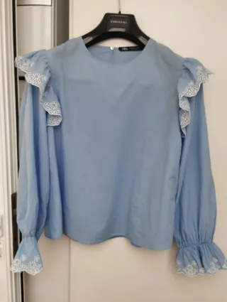 Elegante blusa de Zara con un diseño delicado y femenino. - Manga larga con volantes y bordados. - Puños ajustados con detalle de bordado. - Cuello redondo.