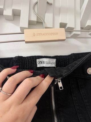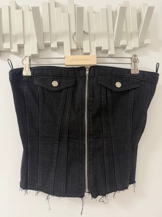 Corsé estilo vaquero en color negro de Zara. Presenta un diseño ajustado con cremallera frontal y detalles de bolsillos. - Cierre de cremallera. - Bolsillos con botón. - Bajo deshilachado.