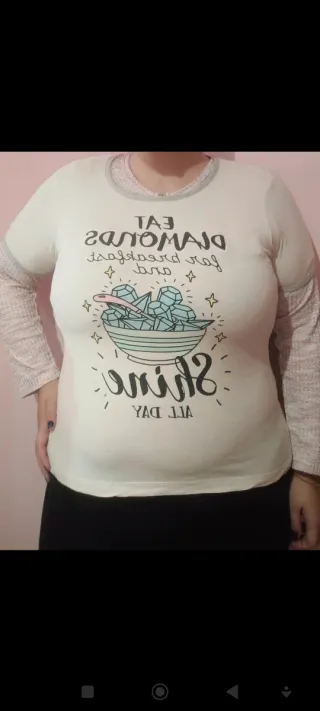 Camiseta con estampado divertido Eat Diamonds for breakfast and shine all day. - Diseño con un tazón de diamantes y cuchara. - Manga larga con detalle de tejido gris jaspeado. - Cuello redondo.