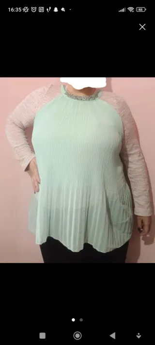 Bonita camiseta con un diseño original y detalles elegantes. - Cuerpo principal en color turquesa con plisado. - Sin mangas en color turquesa. - Cuello adornado con pedrería plateada.