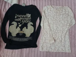 Conjunto de dos camisetas de manga larga con diseños variados. Cada una por separado 3€ las 2 juntas 5€ - Camiseta negra con estampado de ardillas y texto i need to escape with you wild lover. - Camiseta beige con estampado floral en relieve.
