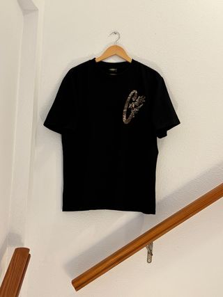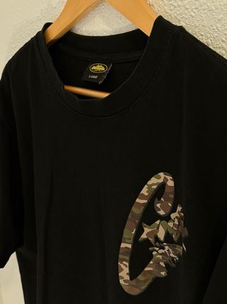 Camiseta negra de manga corta con un diseño distintivo en el pecho. - Logo estampado en camuflaje. - Cuello redondo. Envío inmediato tras la compra.
