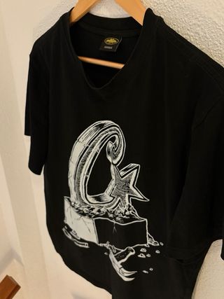 Camiseta negra con un diseño gráfico llamativo en la parte delantera. - Estampado con letra 'C' y estrella. - Detalle de grietas y líquido. Envío inmediato tras la compra.