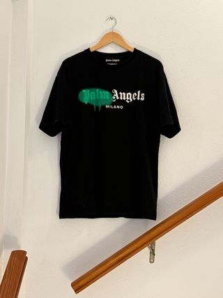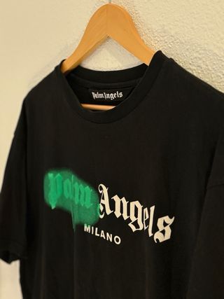 Camiseta negra de Palm Angels con diseño de spray. - Logo de Palm Angels con efecto spray verde. - Detalle de MILANO debajo del logo.