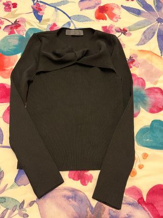 Camiseta negra de punto con detalle nudo en la parte delantera. Lleva un pequeño desperfecto en la parte de izquierda. Talla S.