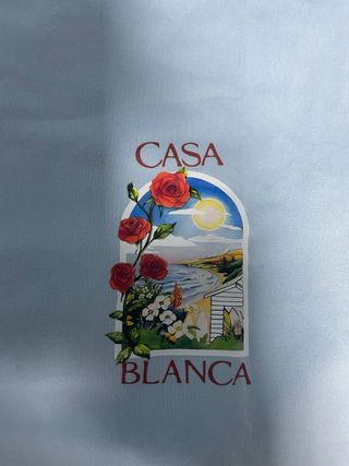 • Artículo: Camiseta de manga corta (T-Shirt). • Marca: CASABLANCA (Marca de moda de lujo, conocida por su estética après-sport y gráficos inspirados en paisajes vacacionales). • Talla: M (Medium). • Color Base: Azul Celeste / Azul Claro (Light Blue). • Diseño Exclusivo: • Gráfico Principal: Impresión grande en la espalda con un paisaje de playa/mar enmarcado por un arco, con rosas rojas y la palabra "CASA BLANCA" en tipografía roja. • Gráfico Delantero: El mismo diseño, pero en tamaño pequeño, ubicado en el pecho (lado izquierdo). • Estética: Clásico diseño que evoca el lujo, el verano y los resorts. • Estado: ¡Nueva! [Indicar si e