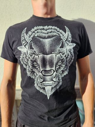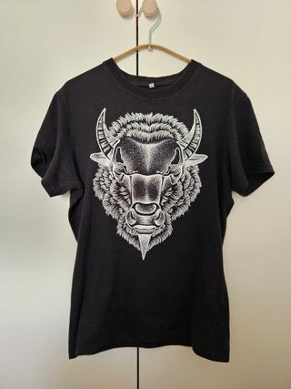 Camiseta de algodón con un diseño original de un bisonte. - Estampado detallado en blanco y negro. - Material: 100% algodón. - Talla M.