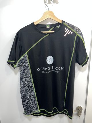 Camiseta deportiva de la marca Roly - Diseño en color negro con detalles multicolor. - Talla M (equivalente a 38-40 / 48-50). - Costuras de contraste en color verde lima. - Panel lateral con estampado gráfico. - Detalles reflectantes en hombro. - Logo Padel6 - club Albaceteño de Padel.