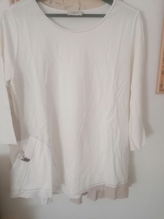 Camiseta o sudadera de manga larga con un diseño moderno y detalles asimétricos. Talla 46 pero es mas bien 44 - Tejido suave y cómodo. - Dobladillo inferior con contraste de color. - Bolsillo lateral decorativo con pinza Su precio 72€