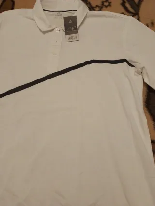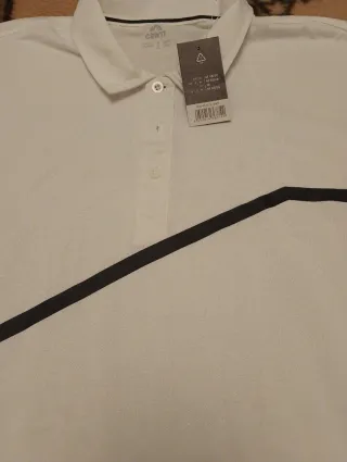 Camiseta de manga corta en color blanco con un diseño moderno. - Franja diagonal negra. - Cuello tipo polo con botones. - Pequeño logo en la parte inferior. - Tejido texturizado.