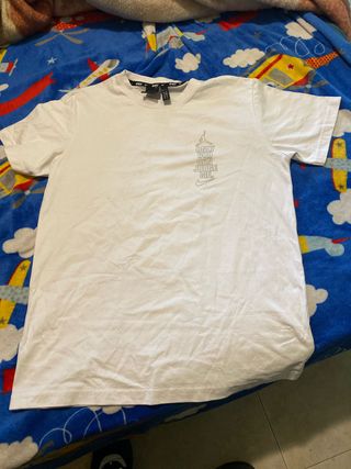 Camiseta de manga corta con estampado de Stranger Things. - Diseño con siluetas de personajes y árboles. - Estampado en blanco y negro. No sé exactamente la talla (M o L) pero dejo las medidas en las fotos.