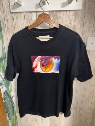 Camiseta negra de la marca Nike con un diseño gráfico llamativo en el pecho. - Estampado de un ojo con el logo de Nike. - Cuello redondo. - Manga corta.