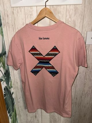 Camiseta de manga corta en color rosa con un diseño llamativo. - Parche con diseño geométrico en forma de X en el pecho. - Detalle de etiqueta en la parte inferior. - Pequeño detalle de 'X' bordado en la manga.