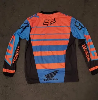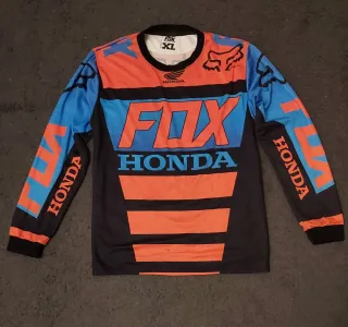 Camiseta de manga larga con diseño llamativo. - Diseño con bloques de color naranja, azul y negro. - Logos de Fox y Honda. - Talla XL.