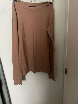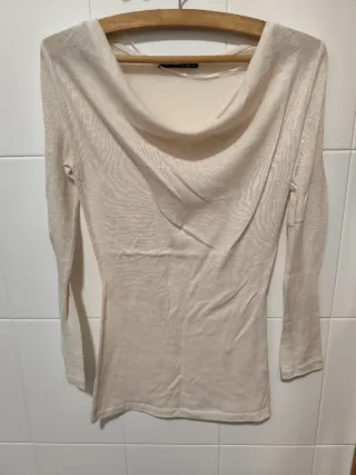 Camiseta beige de manga larga con cuello drapeado. - Tejido ligero y vaporoso. - Diseño ajustado a la cintura. - Cuello tipo cascada.