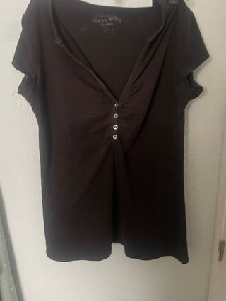 Camiseta de manga corta con escote en V y detalle de botones. - Diseño con fruncido en la parte delantera. - Botones decorativos en el escote.