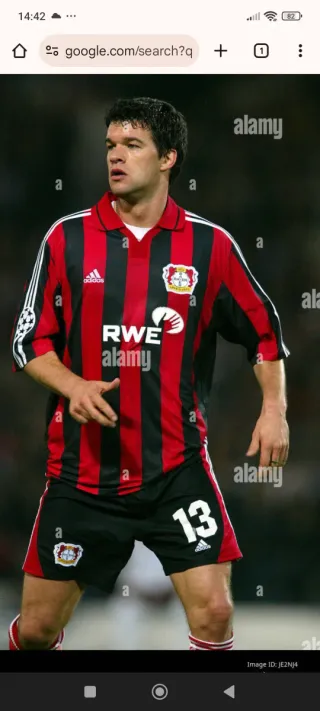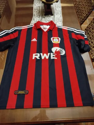 Camiseta de fútbol vintage del Bayer Leverkusen de la época de Michael Ballack. Un diseño clásico con las icónicas rayas verticales. - Logo de Adidas bordado. - Escudo del club en el pecho. - Detalle de las tres rayas en las mangas.