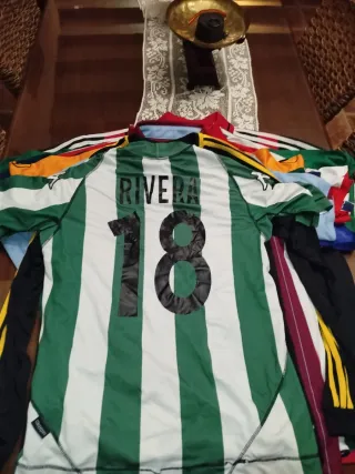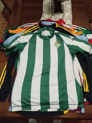 Camiseta del Real Betis Balompié. - Diseño a rayas verticales. - Escudo del club en el pecho.