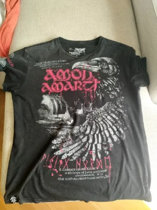 Camiseta de la banda Amon Amarth con un diseño llamativo. Camiseta usada pero en muy buenas condiciones. - Estampado frontal con cuervo y barcos vikingos. - Letras de la canción The Pursuit of Vikings en rosa. - Estilo vintage desgastado.