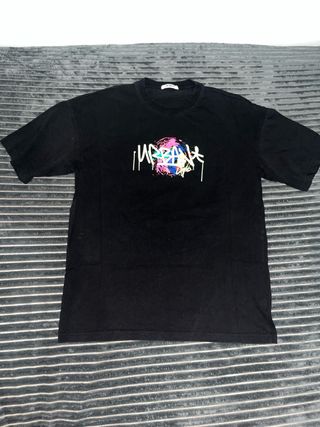 Camiseta negra con un llamativo estampado gráfico en la parte delantera. - Diseño moderno y urbano. - Cuello redondo. - Manga corta.