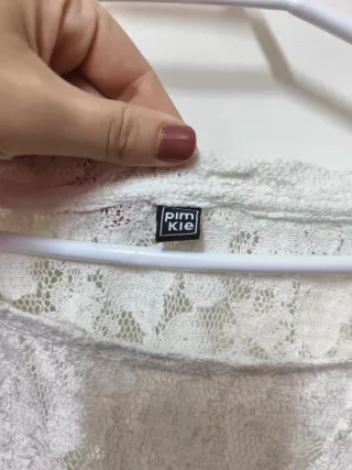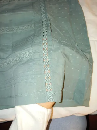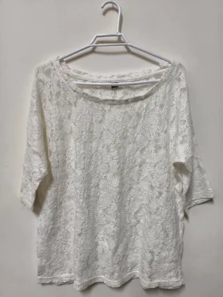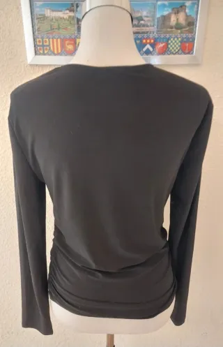 Camiseta manga larga, escote y mangas de tul, semicuello. Talla M. Precio 4 euros