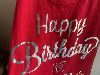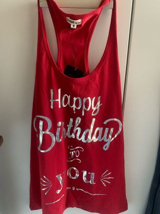 Camiseta de tirantes roja con mensaje de Happy Birthday. - Diseño con letras plateadas. - Estilo racerback. - con la etiqueta puesta, sin estrenar